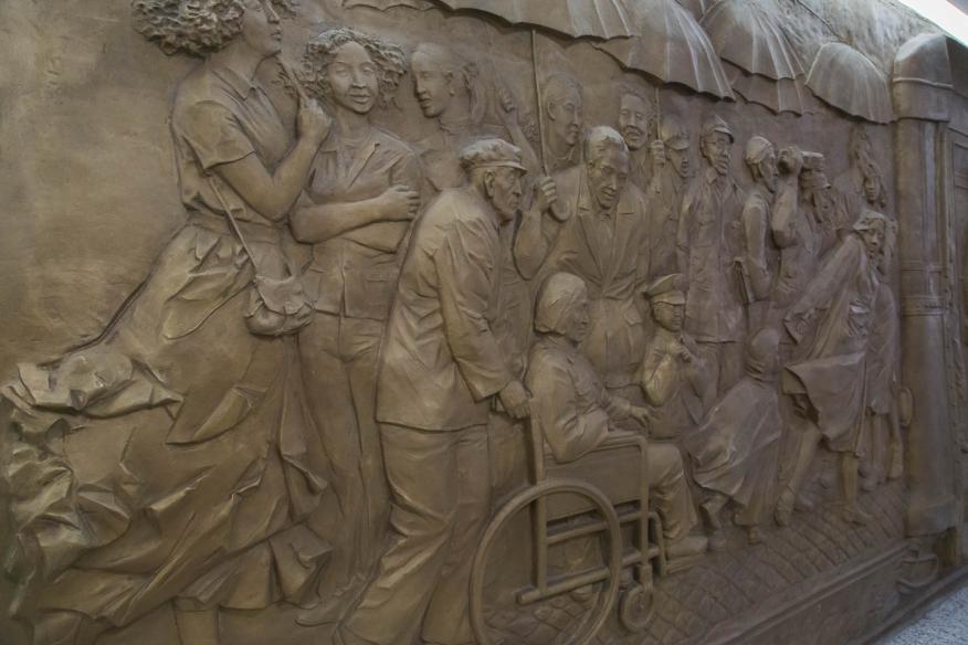 作品说明:这件公共艺术作品以记录着这座城市历史变迁的书籍为设计元素,以圆雕与高浮雕结合的艺术表现形式,打造了一面铭刻着从“长春厅”始创至今两百余年发展历史的书墙,凸显了长春这座洋溢着书香和人文气息的城市尊重历史,尊重文化的品格。