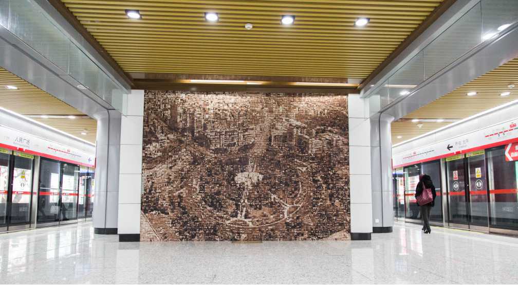 作品说明:地铁公共艺术是城市特有的文化名片,艺术家采集了海量长春市民“笑脸”肖像以及城市富有记忆的经典建筑、历史街区,融合森林、电影、汽车、冰雪、雕塑文化等元素,运用釉中彩等创作手段制作成5x5cm的高清瓷板,总数量5696块,拼成一副俯瞰人民广场的图像,作品强调地域文化识别性,将城市公共空间打造成为具有公众参与性和凝聚春城人民向心力的人文艺术中心。