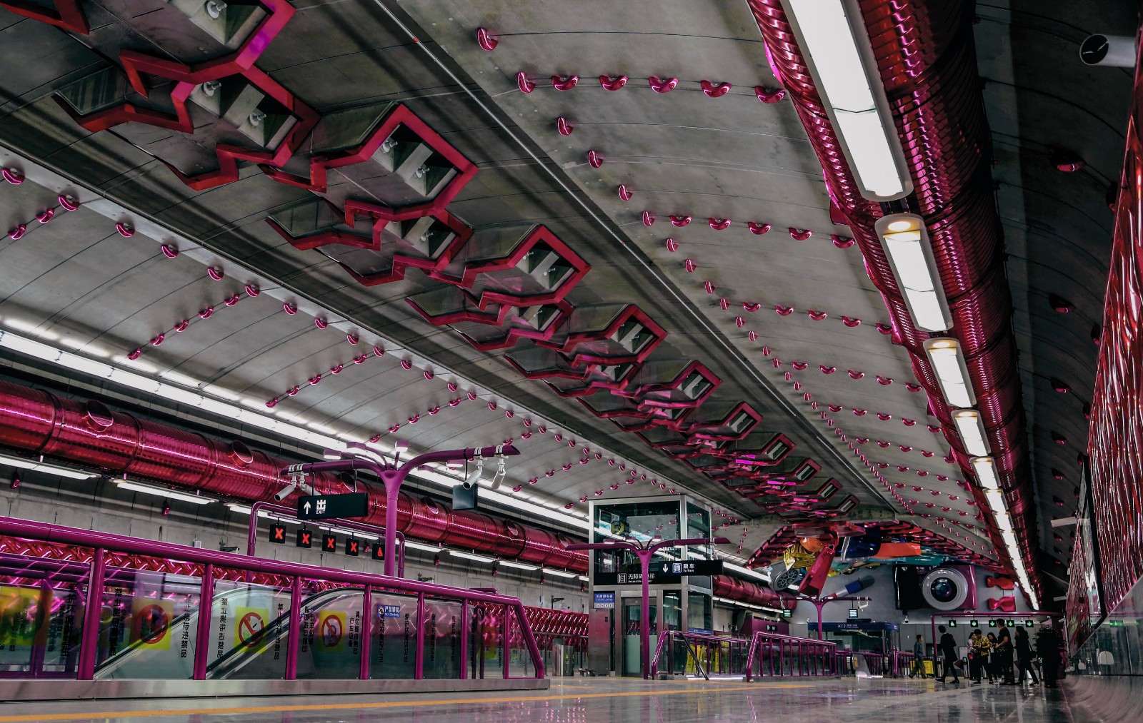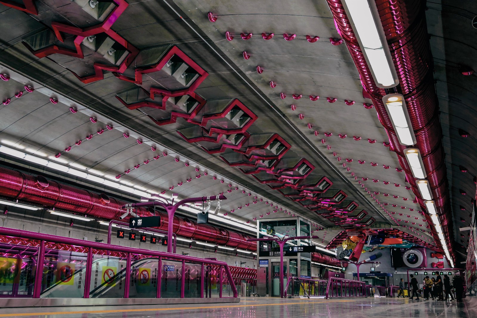 本站的公共艺术作品从空间一体化的设计理念出发,凸显了时尚摩登的时代感和亲民性,充分运用装配站特 有的空间结构和色彩基调,将整个站厅层做成一个女士提包的内部。顶部的混凝土预制结构设计成拉链造型, 贯穿整个站厅层空间,利用横纵的线条增强空间的纵深感和围合感。提包拉链展开的部分呈现出的都是年轻 人的日常用品。站厅层的艺术设计与站台层主题、风格和色调相呼应,以充满想象力的空间重构,现成品放 大的形式和具象的视觉语言,兼顾了作品的审美价值和实用功能。