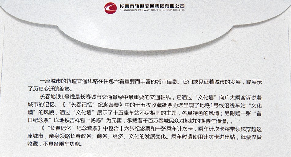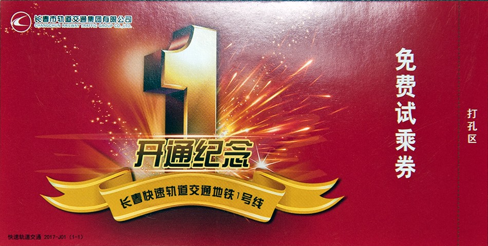长春轻轨1号线“长春站-卫光街”试运营纪念车票
