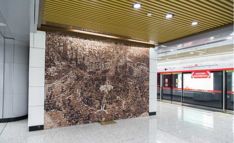 作品说明:地铁公共艺术是城市特有的文化名片,艺术家采集了海量长春市民“笑脸”肖像以及城市富有记忆的经典建筑、历史街区,融合森林、电影、汽车、冰雪、雕塑文化等元素,运用釉中彩等创作手段制作成5x5cm的高清瓷板,总数量5696块,拼成一副俯瞰人民广场的图像,作品强调地域文化识别性,将城市公共空间打造成为具有公众参与性和凝聚春城人民向心力的人文艺术中心。