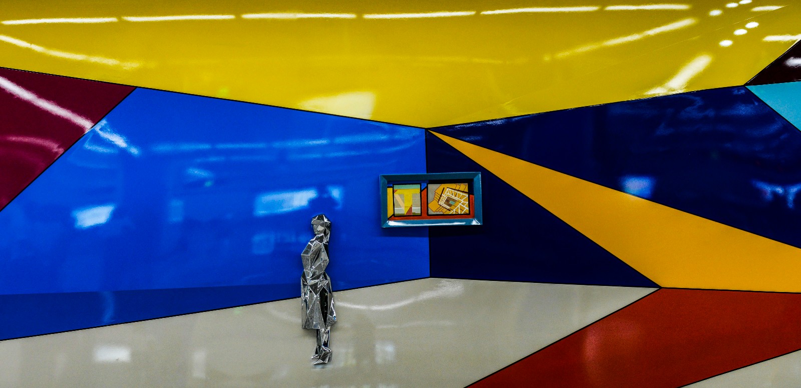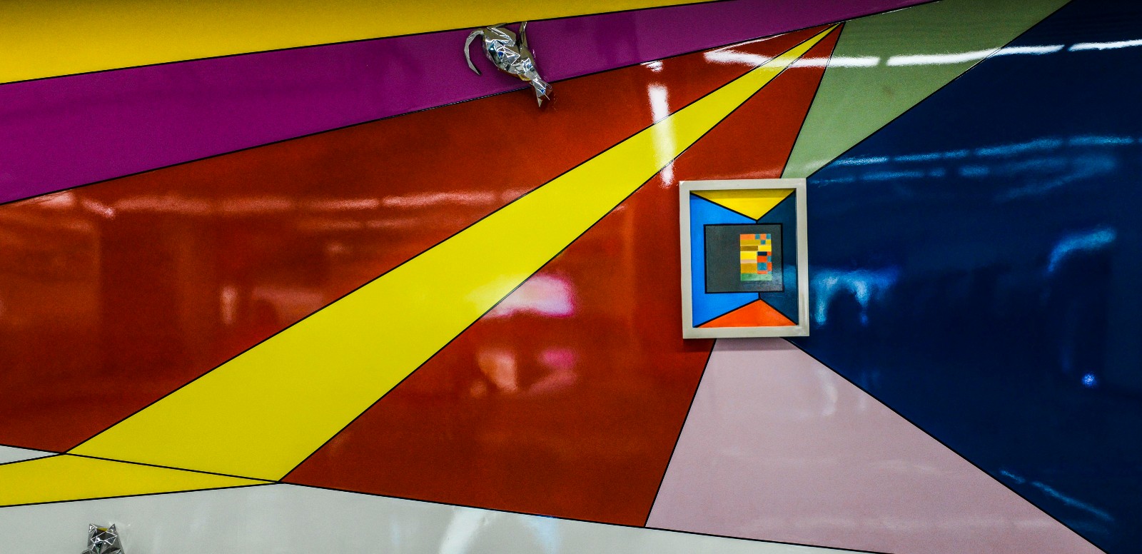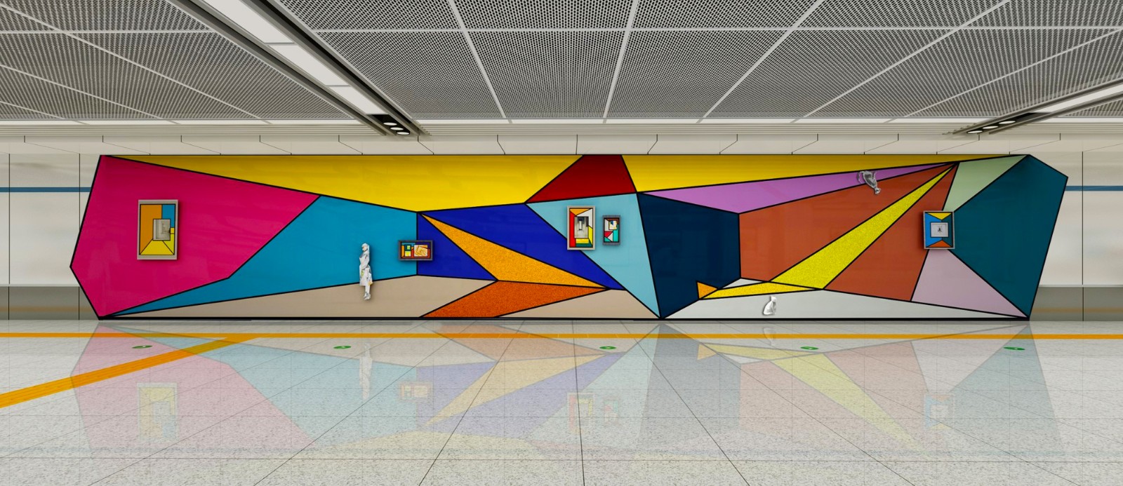 本站的公共艺术作品运用了波普艺术的语言,以饱和跳跃的色彩和空间的夸张透视与重组,通过由二维空间到多维空间的转换,构成了一个“地铁中的美术馆”,是对附近老城区地上空间的激活和艺术品质的提升, 为观者带来遐想的空间和美的享受。作品中重构的“空间”,不仅是一个艺术生活化,生活艺术化的空间, 更象征着一个充满了人文艺术气息,承载着长春人美好生活向往的“共享空间”。