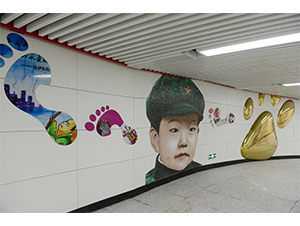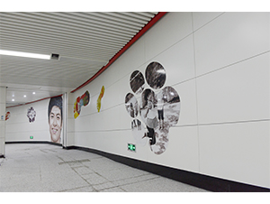 作品说明:这件公共艺术作品采集了很多长春市民的脚印和笑脸,将人们由幼年到老年的成长印记贯穿为一个承载着快乐记忆的通道,在孩子们脚印的剪影图片中还镶嵌着可以映照出行人影像的凹凸镜,使其更有互动性和趣味性。作品以跃动的色彩,活泼而充满趣味感的艺术形式,使整个地铁空间成为一个将个体成长的印记、集体记忆与城市脉动连接起来的鲜活载体。创作主持:殷小烽、王中策划执行:武定宇、赵一璟创作团队:范文博、孙鑫创作时间:2018年9月